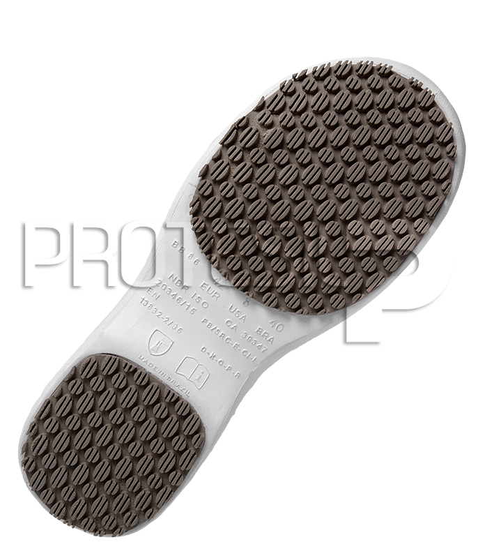 SOLADO ANTIDERRAPANTE  produzido com a tecnologia Super Grip, possui borracha sintética especial (nitrílica) e borracha natural, altamente resistente ao escorregamento em pisos cerâmicos com solução SLC (detergente) e em pisos de aço com solução de glicerol.