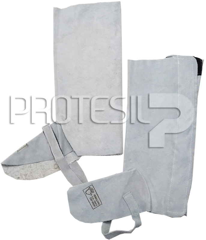 Perneira de segurança confeccionada em raspa, fechamento em velcro, metatarso com tira em raspa para ajuste no pé.